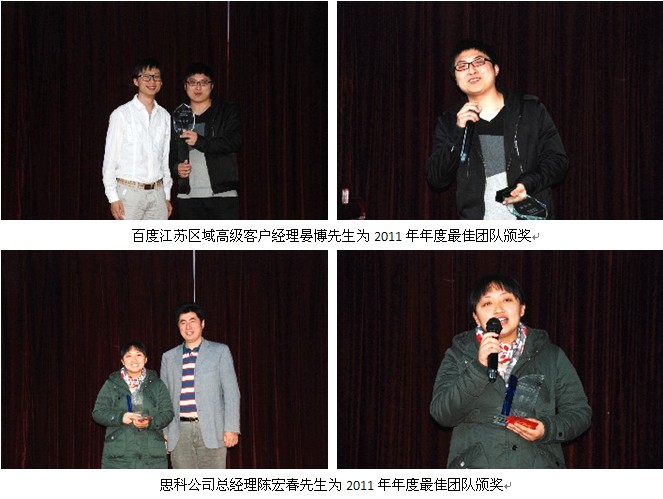 2012年4月17日下午4點,鹽城思科客服部2011年度總結(jié)表彰活動在公司大會議室隆重召開,本次活動對2011年度的優(yōu)秀團隊及個人分別進行了表彰。百度江蘇區(qū)域高級客服經(jīng)理晏博及區(qū)域客服經(jīng)理張同二位領(lǐng)導(dǎo)也出席了本次活動,更加使所有員工充分體會到了這份榮譽的來之不易。